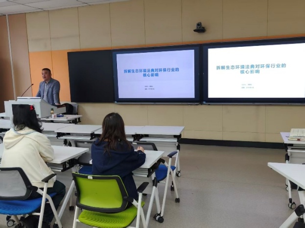 讲座中,黄彪专家从立法精神、企业合规、行业发展三个维度,深入解读生态环境法典的深远影响。他阐释“四个统一”监管重塑与排污许可“一证式”管理,强调法典实施后违法成本提升、按日连续处罚、双罚制等刚性约束;并指出环境检测行业正从粗放发展转向规范运营,强制监测、碳监测、数据终身追责等要求,对从业者合规能力提出更高要求,勉励大家成长为技术、法规与管理兼备的复合型环保人才。互动环节,同学们围绕专业就业、人才需求、核心能力储备踊跃提问。黄彪结合自己15年从业经验表示,严管是挑战、合规是机遇、专业是底气。他提到,合规检测机构、智慧监测、碳管理等领域人才需求旺盛,建议同学们夯实专业基础,关注数字化与碳核算前沿,提升复合能力,树立职业信用意识。