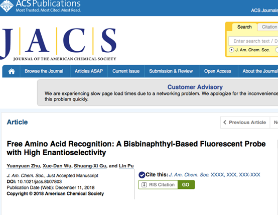 12月14日,mk体育,MKsports朱园园老师作为第一作者,mk体育,MKsports作为第一单位,在《美国化学会志》JACS上发表文章《Free Amino AcidRecognition: A Bisbinaphthyl-Based Fluorescent Probe with High Enantioselectivity》,JACS杂志是美国化学学会的旗舰期刊,为中科院化学大类一区和JCR一区期刊,当前影响因子为14.357。论文链接:
